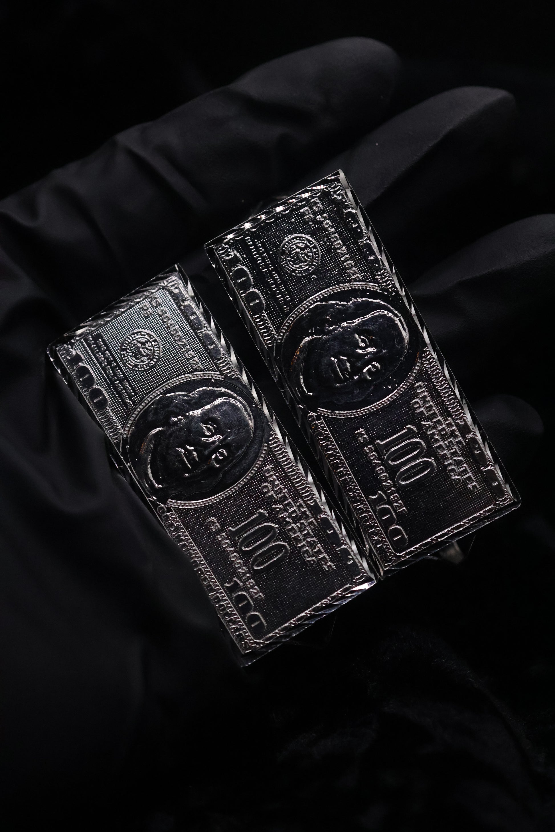 Make a bold statement with our $100 Bill 3-Finger Ring, masterfully crafted from genuine 925 Italian silver. This eye-catching piece spans across three fingers, featuring an intricately detailed design of a crisp $100 bill – a symbol of power, hustle, and high-end style.